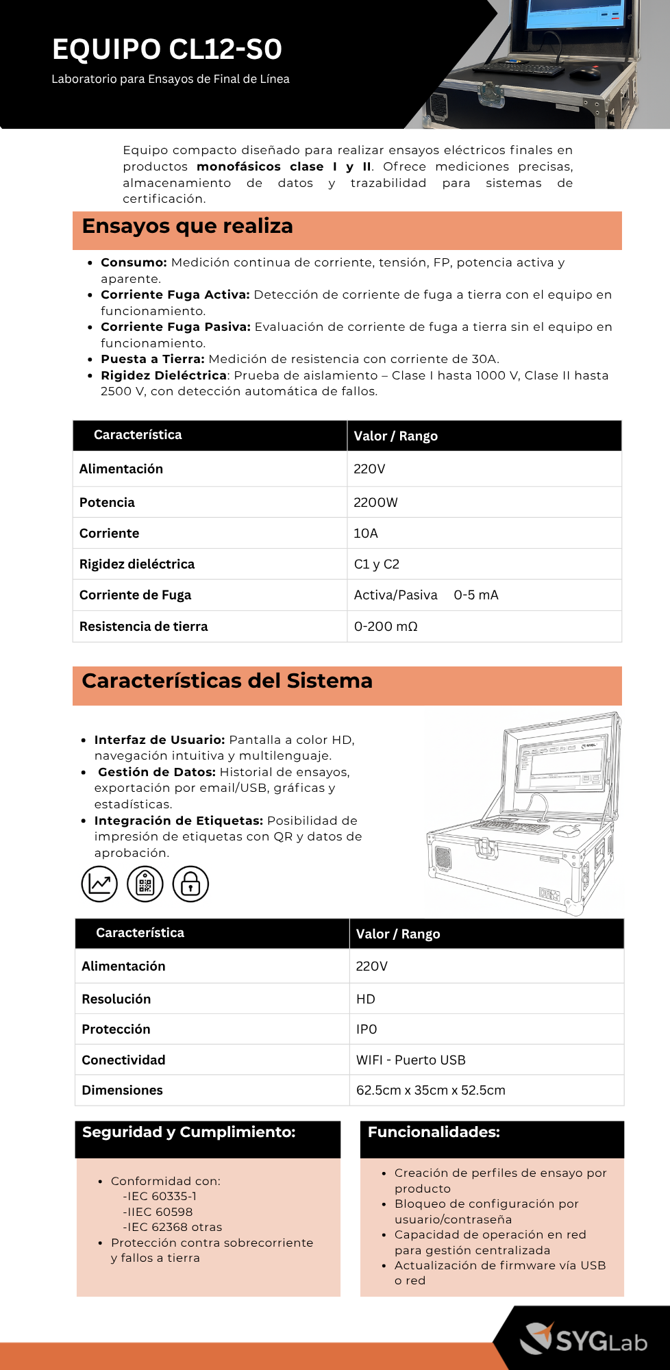 Equipo compacto diseñado para realizar ensayos eléctricos finales en productos monofásicos clase I y II.