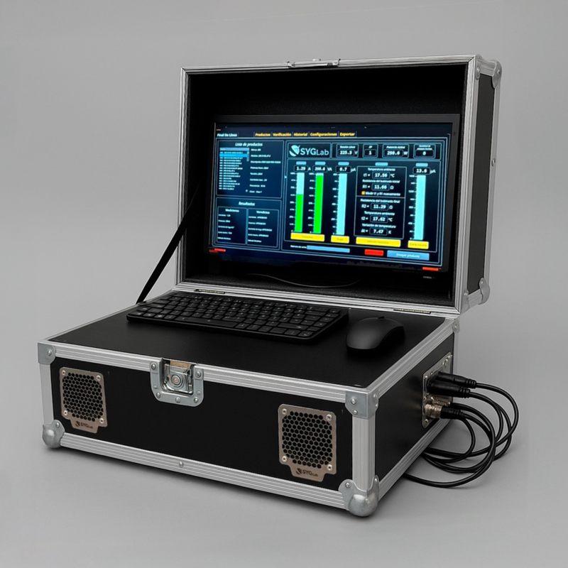 Equipo compacto diseñado para realizar ensayos eléctricos finales en productos monofásicos clase I y II, incorporando sensores de temperatura para un control adicional durante las pruebas.